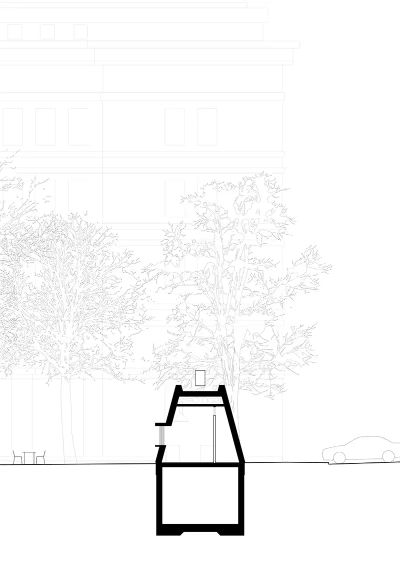 ZHS The new kiosk under the row of trees on the eastern side of th, with its decided expansion along the long side of the square, brings together gastronomy, market office and public toilets in one infrastructure.-Designed as a meeting point, the long, narrow kiosk emphasises the intersection of the pedestrian diagonals on the square and the connection with the leisure promenade coming from Stadthausquai. The compact volume of the newly designed kiosk occupies the minimum amount of space at the edge of the square, both visually and spatially, that allows for full usability. Furthermore, the structure shields the consumption area from Fraumünsterstrasse, creating a partial background for the otherwise open square.